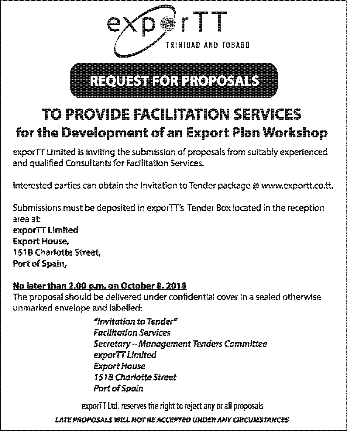 Request for Proposal - TO SUPPLY FACILITATION SERVICES FOR WORKSHOP “DEVELOPING AN EXPORT PLAN” 25 Sep 2018 by exporTT Admin chat_bubble_outline 0 comment(s) Click to view :